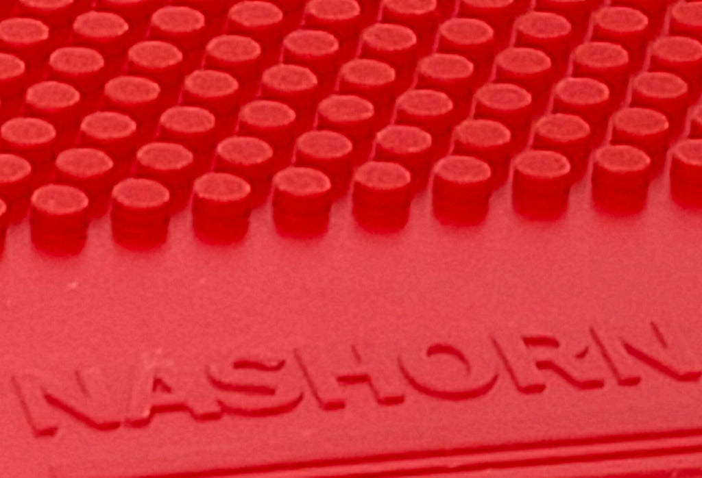The new Pro version of the Nashorn will completely replace the old version in the medium term. However, this new version is not faster than the old version in the sponge variants, but is deliberately considerably slower. So far the Degu II has been our slowest short stud (speed value 7), then came the Degu (speed value 8.5) and so far there has been nothing in between. That is why we have developed the Nashorn Pro, which is between the Degu and the Degu II in terms of speed and also offers a significantly higher disturbing effect that is comparable to medium-sized studs. We have never had such a short stud in our range and in that respect the Nashorn Pro is a very useful addition to our range. The studs of the Nashor Pro have an almost cylindrical shape (only under a magnifying glass can you see that they are slightly conical). They are also quite wide and only slightly higher than the allowable minimum of 1.0mm. The distance between the studs is average. The stud heads are finely grooved. The rubber mixture is very elastic, but also very grippy and quite soft. In practice, this means that the Nashorn Pro is the first short stud rubber whose studs have a clearly noticeable "wobble effect" while playing. The Nashorn Pro is a short stud with all-round speed. Topspins and hard finishing shots are not the strength of this rubber, but counterattacks and blocking balls are. These are very easy, controlled and effective to play with the Nashorn Pro, but backspin balls are also very possible with the Nashorn Pro and have a lot of spin for a short pimpled rubber. We especially recommend the Nashorn Pro to players who play close to the table. The Nashorn Pro is suitable for players of all levels and can also satisfy top players. The Nashorn Pro should mainly be used as a backhand rubber. This rubber lacks the penetrating power on the forehand side; only classic defensive players could be happy with the Nashorn Pro as a forehand rubber. Please note: The text on the back of the rubber cover no longer has anything to do with the current rubber. We still need to format the already printed covers before we can make any changes.